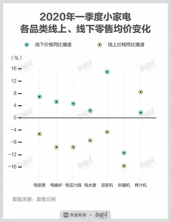 线上销量大增的另一面,是价格战更加激烈。奥维云网数据显示,一季度小家电线上均价除榨汁机同比增长8.2%外,其余品类均不同程度下降,销量同比增长最多的料理机,均价降幅最大、同比下降15.7%。