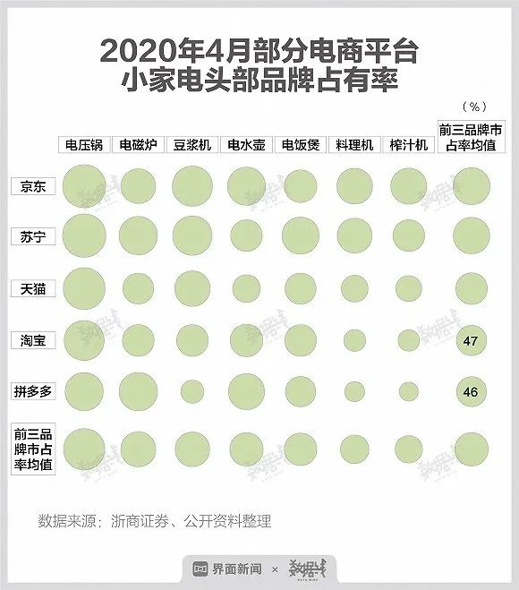 以4月份各大电商平台的小家电销售为例,社交属性较高的拼多多、淘宝等平台,小家电品牌集中度较低,如拼多多和淘宝小家电前三品牌市占率仅分别为46%和47%。