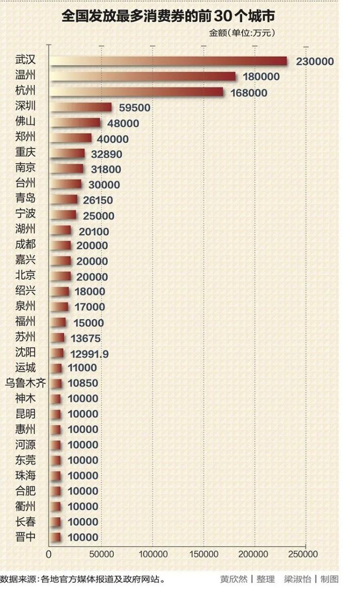 他说,这个数据主要由商务局来统计。根据公开资料梳理,消费券的派发多由各地商务局主导,资金来源则是地方财政。