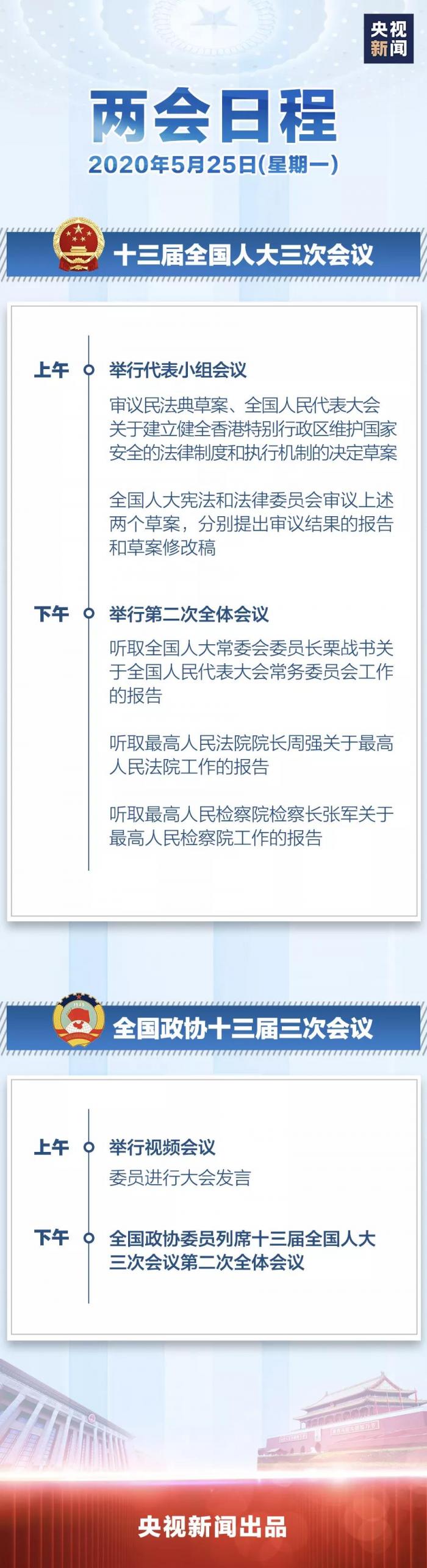 根据日程安排:25日上午,十三届全国人大三次会议举行代表小组会议,审议民法典草案、全国人民代表大会关于建立健全香港特别行政区维护国家安全的法律制度和执行机制的决定草案;全国人大宪法和法律委员会审议上述两个草案,分别提出审议结果的报告和草案修改稿。