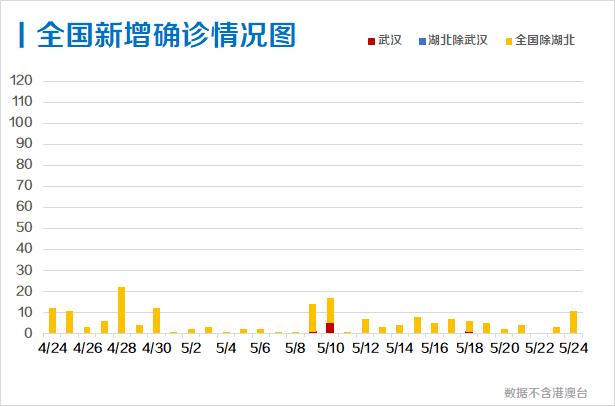 5月24日,全国(不含港澳台,下同)新增确诊病例11例,均为境外输入病例(内蒙古10例,四川1例)。全国现有确诊病例83例,较前一日相比有所反弹。湖北方面,武汉以外地区已保持79天零新增,武汉连续6天零新增。