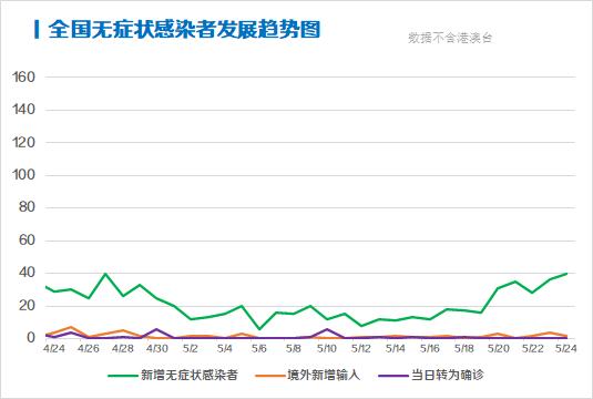 5月24日,全国新增无症状感染者40例,其中,湖北新增无症状感染者38例,无境外输入病例;当日无转为确诊病例;当日解除医学观察15例(境外输入2例);尚在医学观察无症状感染者396例(境外输入28例)。
