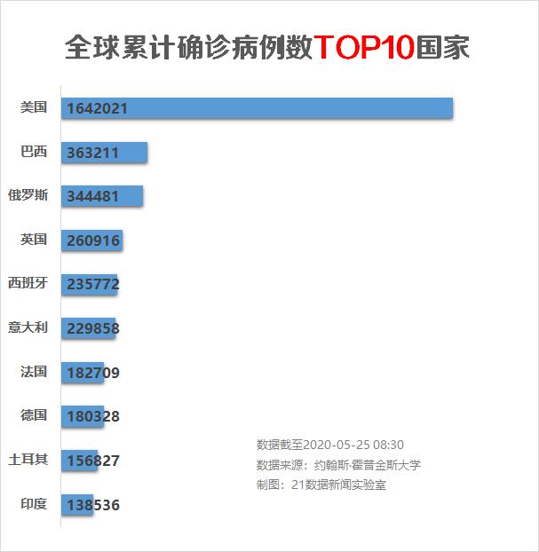 海外网报道,据美国约翰斯·霍普金斯大学发布的实时统计数据显示,截至北京时间5月25日6时30分,全球累计确诊新冠肺炎病例5380774例,累计死亡343800例。
