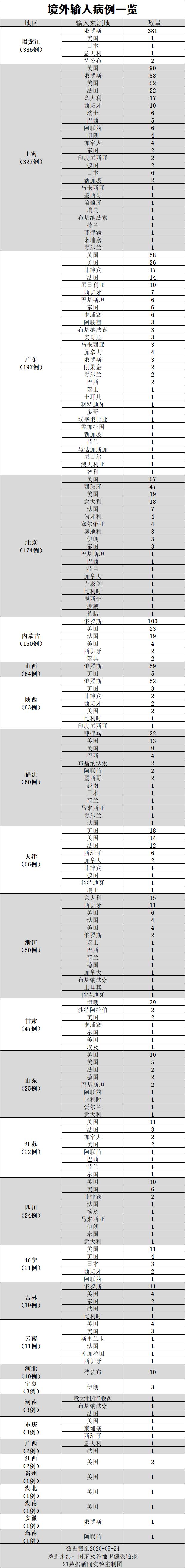 截至5月24日24时,全国累计报告境外输入确诊病例1724例,俄罗斯、英国、美国是境外输入主要来源地。其中,俄罗斯已累计输入病例697例,英国输入312例,美国输入181例。(详情查看文末附表:境外输入病例一览)