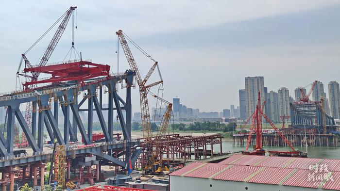 △21日傍晚,武汉晚霞染红天际,长江大桥上川流不息。