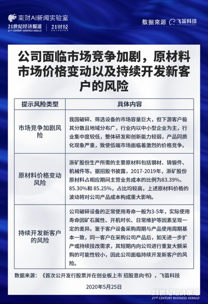 因此,浙矿股份提示,2017-2019年,公司的主营业务收入中来源于新客户的收入占比分别为 80.80%、61.93%和 74.04%。未来若公司无法在维护原有客户的基础上,持续开拓新的客户或市场,或在开拓新客户、新市场时遭遇较大困难,将可能对公司的经营业绩造成不利影响。