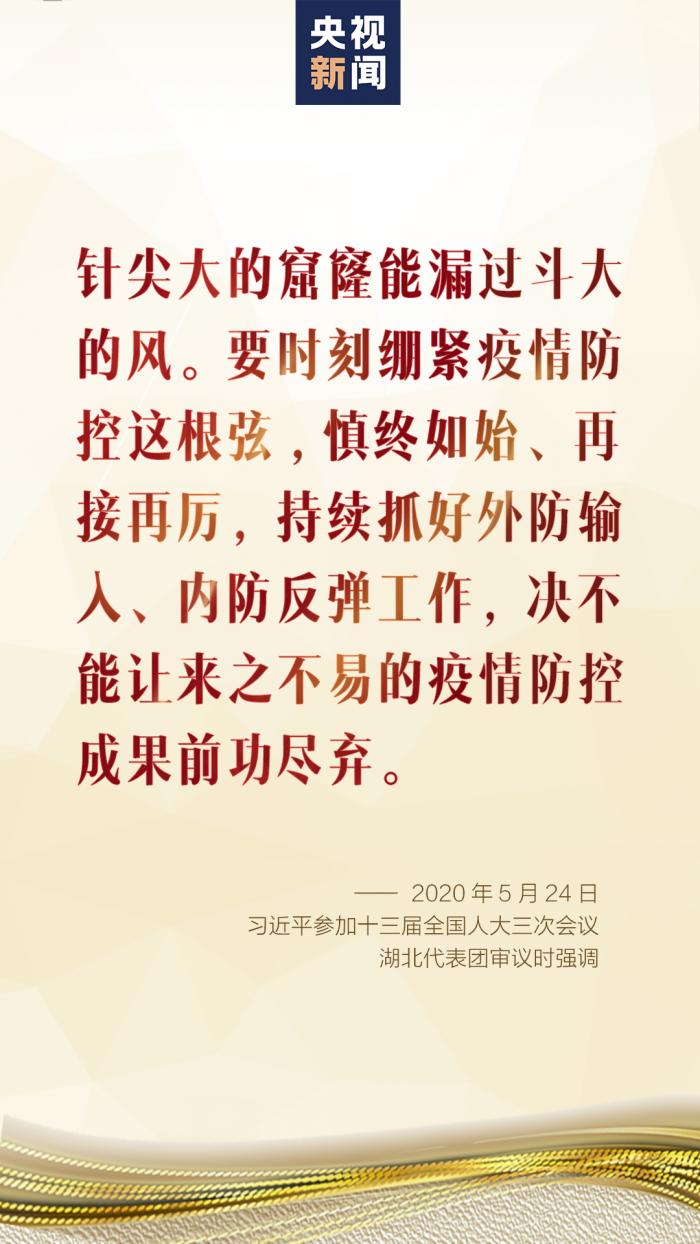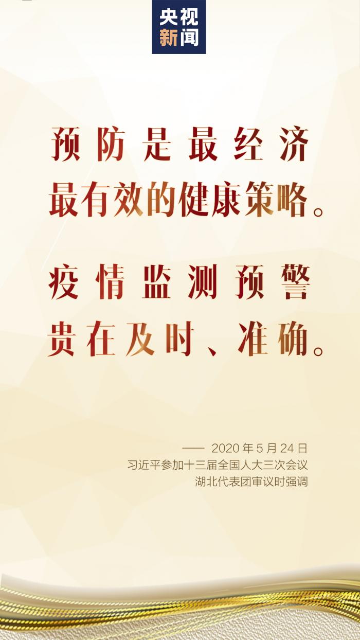 习近平24日下午在参加十三届全国人大三次会议湖北代表团审议时强调,防范化解重大疫情和突发公共卫生风险,事关国家安全和发展,事关社会政治大局稳定。