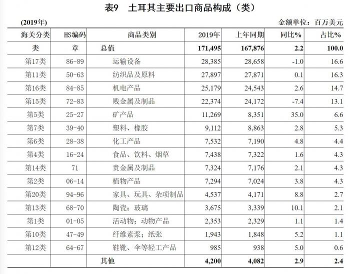 土耳其的服装和纺织工业是该国的制造业分支之一,该国已从8300万人的国内需求和主要来自欧洲的外国需求中获得了蓬勃发展,并成为了土耳其经济中的支柱性产业。据土耳其统计局统计,2019年,运输设备、纺织品及原料和机电产品是土耳其的主要出口商品,分别占土耳其出口总额的16.6%、16.3%和14.7%,为283.9亿美元、279.0亿美元和251.8亿美元。
