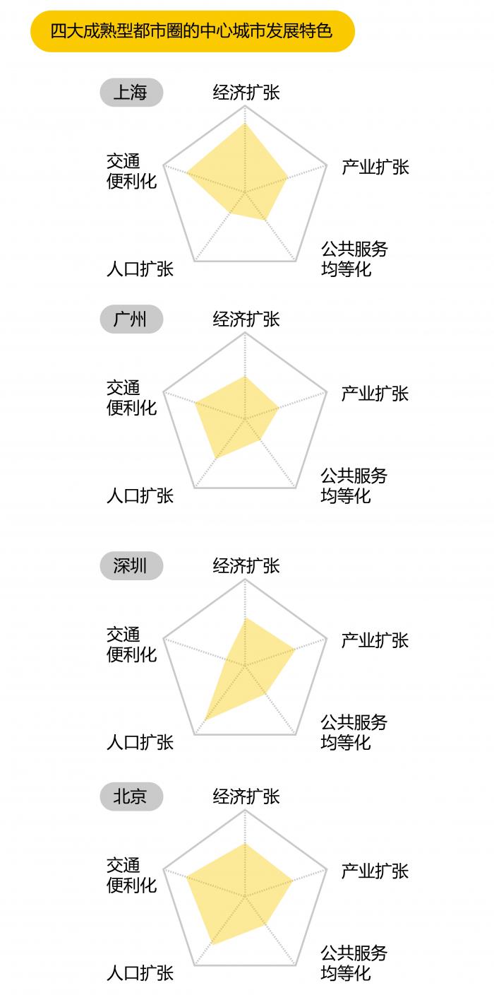 这些中心城市经济发达,产业集聚,生活成本也相对较高,人员通勤和产业集聚已经向周边地区大量扩散,城市边界明显突破了行政区划。在这些中心城市,其中心区与周边区域的联系,都市圈进入了空间上从“点状扩散”到“网状发展”的阶段,新增人口的聚集地已经主要集中在城市外环,公共服务均等化也开始进入落地阶段,产业联系从外溢-承接关系开始向合作共建关系演变。