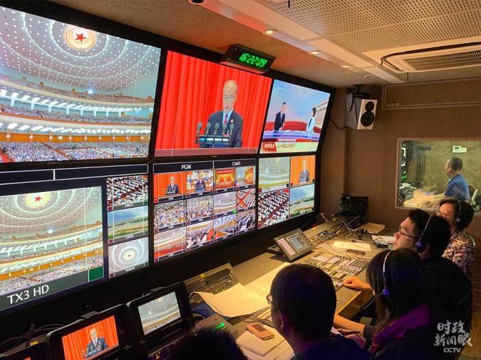 △25日,中央广播电视总台现场直播全国人大会议第二次全体会,这是转播车内工作现场和会场内。(总台央视记者王志明、杨波拍摄)