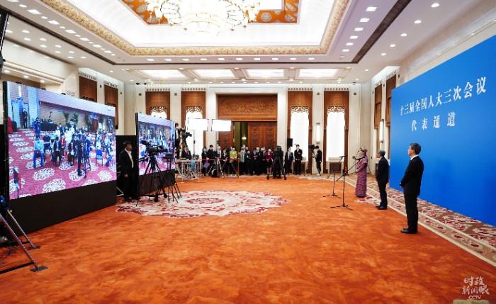 △人大、政协新闻发布会及“三大通道”采访活动都是通过人民大会堂与两会新闻中心(梅地亚中心)视频连线的方式实现。(总台国广记者李晋拍摄)