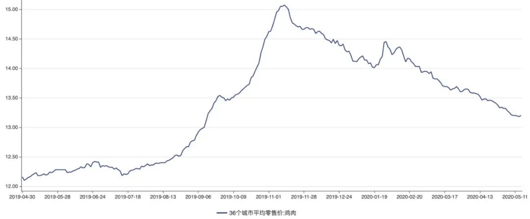 而鸡肉价格自去年11月起持续下滑。国家发改委数据显示,截至5月14日,国内鸡肉价格为13.2元/斤,较去年11月初相比已下降12%。