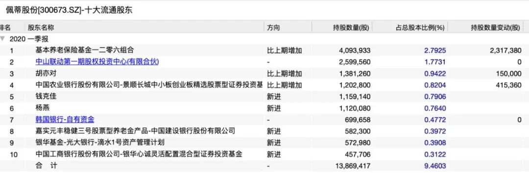 佩蒂股份一季报显示,嘉实元丰稳健三号股票型养老金产品-中国建设银行等三只产品新进入公司的十大流通股东名单。Wind数据显示,佩蒂股份的基金持股比例已由2019年底的3.36%上升至5.62%。