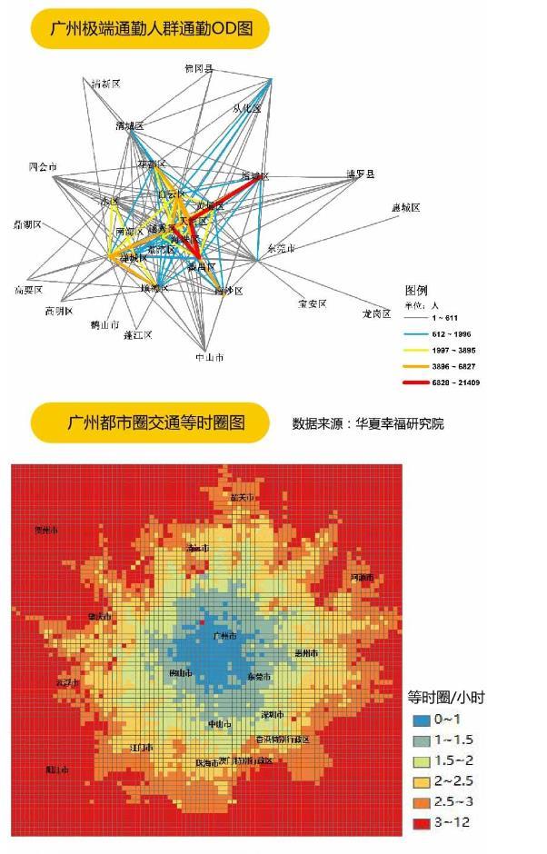通勤数据显示,广州与周边的联系强度来看,已经形成了广州-佛山,广州-清远,广州-惠州等多条大廊道。