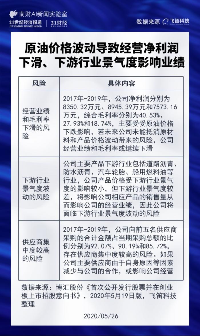 公司招股说明书披露的风险点中,有三个风险值得关注。分别为由原油价格波动带来的经营业绩和毛利率下滑的风险、下游行业景气度波动的风险、供应商集中度较高的风险。