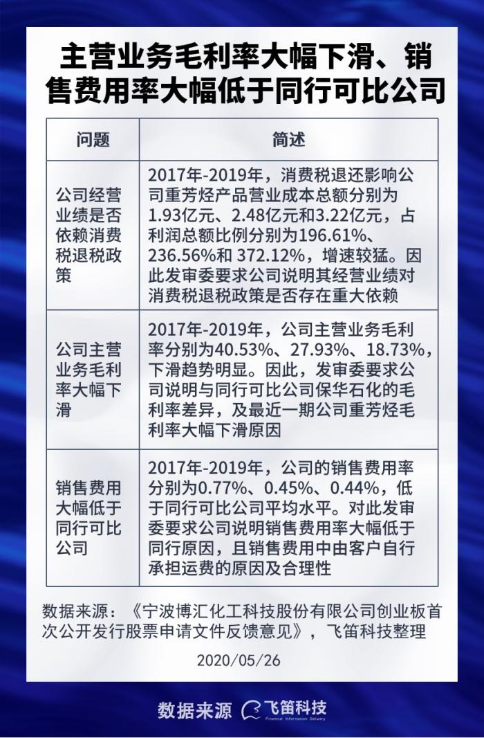 2019年4月4日,发审委对公司招股书给出了反馈,就公司规范性问题、信息披露问题、与财务会计资料相关的问题、其他问题4方面提出了多个问题。其中,有3大问题值得特别关注,分别是公司经营业绩对消费税退税政策是否存在较大依赖、主营业务毛利率大幅下滑、销售费用大幅低于同行可比公司的问题。