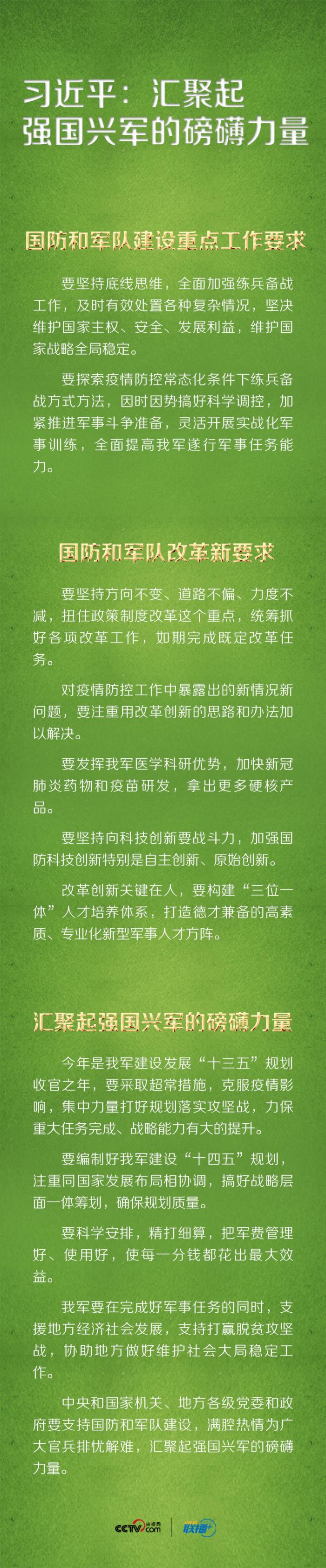 习近平结合做好疫情防控工作,就国防和军队建设重点工作提出要求。他强调,这场疫情对世界格局产生了深刻影响,对我国安全和发展也产生了深刻影响。要坚持底线思维,全面加强练兵备战工作,及时有效处置各种复杂情况,坚决维护国家主权、安全、发展利益,维护国家战略全局稳定。要探索疫情防控常态化条件下练兵备战方式方法,因时因势搞好科学调控,加紧推进军事斗争准备,灵活开展实战化军事训练,全面提高我军遂行军事任务能力。