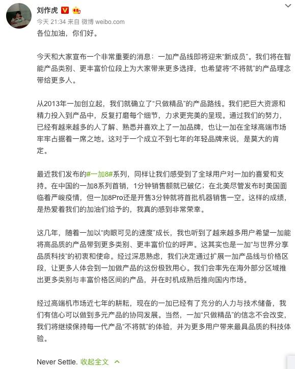 5月26日晚间,一加手机创始人兼CEO刘作虎宣布开启多元化策略。他在社交平台表示,“我们将在智能产品类别、更丰富价位段上为大家带来更多选择,也希望将‘不将就’的产品理念带给更多人。”