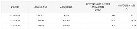 深交所官网发布QFII/RQFII/深股通投资者信息显示,截至5月26日,已有三只深市股票外资持股比例已超过26%——索菲亚、美的集团、华测检测截至最近交易日外资合计持股比例分别达到26.77%、27.28%、26.23%。