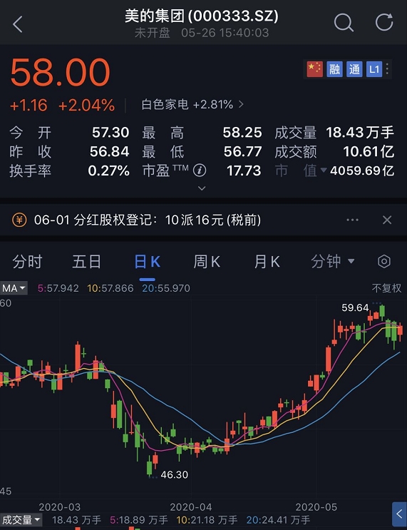 美的集团自然不用多说,国内家电的龙头公司,而美的也是2020第一只被外资买爆的股票,在1月份的时候,深交所和港交所分别发布公告,表示美的集团的外资持股比例达28%,触及“限购线”,暂时只能卖出不能买入。1月22日,全球最大的指数编制公司MSCI也发布公告,将美的集团从MSCI全球标准指数以及MSCI中国全股票指数中剔除。受这两大消息影响,美的集团连续两日股价大跌。