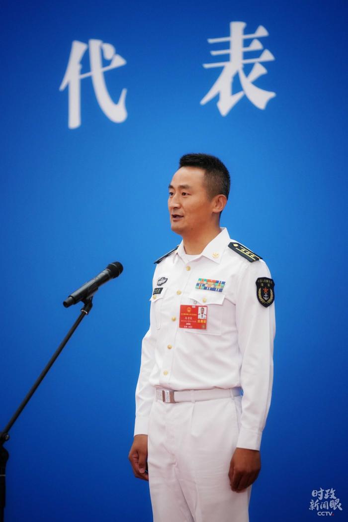 △25日,全国人大代表、海军某导弹驱逐舰舰长赵岩泉在“代表通道”上讲述自己在索马里护航的经历。(总台国广记者李晋拍摄)