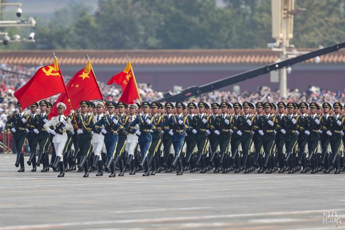 △2019年国庆阅兵仪式上,仪仗方队护卫党旗、国旗、军旗走在徒步方队的最前方。