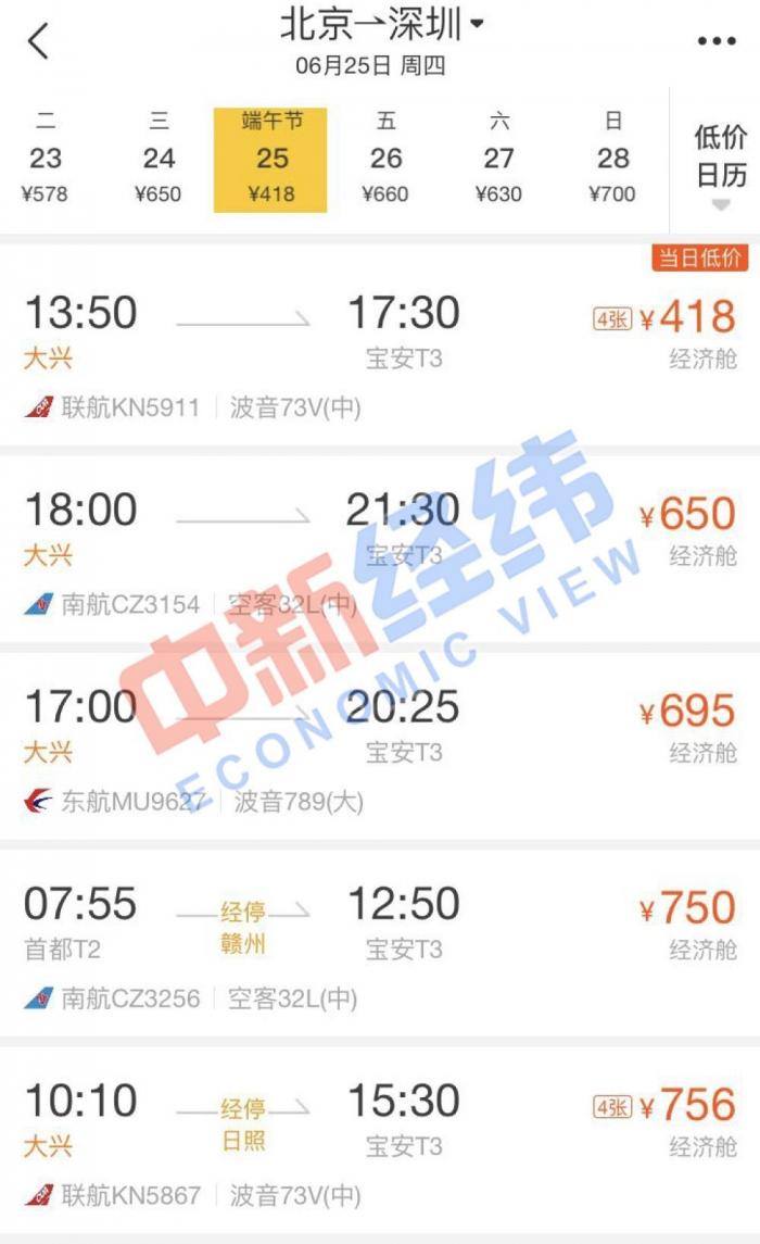 面对即将到来的端午节假期,即使没有买到高铁票也没关系。通过第三方售票平台发现,端午节当天,北京到多个城市的机票价格比高铁还实惠,个别航班甚至便宜超一半。