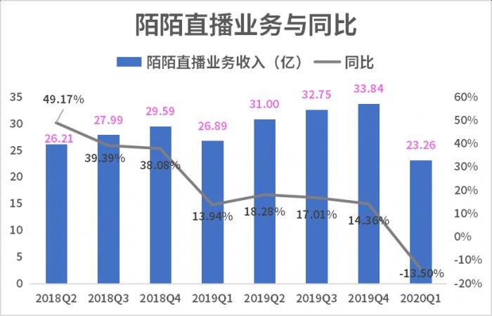 上图是陌陌的直播业务收入。这块业务收入2020年一季度收入为23.26亿元,同比下滑了13.5%,环比下滑了31.3%。收入萎缩最厉害。