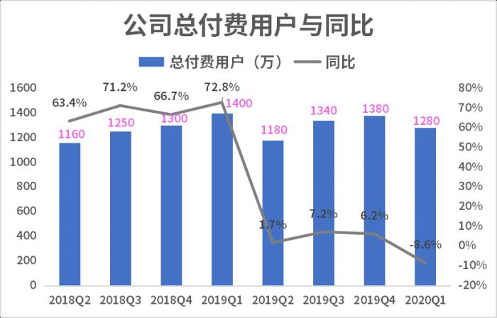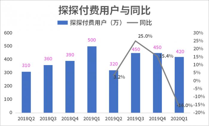 公司仅披露包括陌陌和探探在内的总付费用户数和探探自身的付费用户数,从上图可以看到,一季度公司的总付费用户为1280万人,同比减少了8.6%,这也是最近8个季度公司付费用户首次出现负增长。