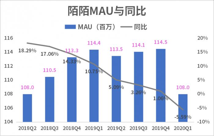 公司财报中,跟陌陌app相关的指标更多一些。上面是陌陌的月活数据。从2018年四季度开始,陌陌的月活就已经出现见顶趋势,对应的是月活的同比增速趋势性下滑。到今年一季度,陌陌的月活下降到只有1.08亿人,同比下滑5.59%,首次出现同比负增长。