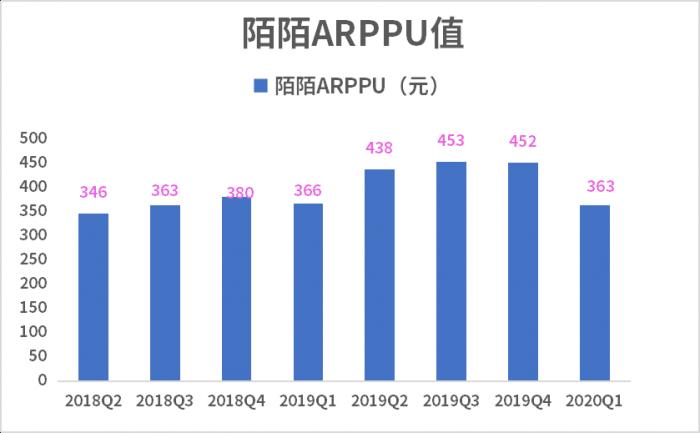 从上图可以看到,一季度陌陌的ARPPU值为363元,略低于去年同期,跟过去三个季度比,明显下跌。