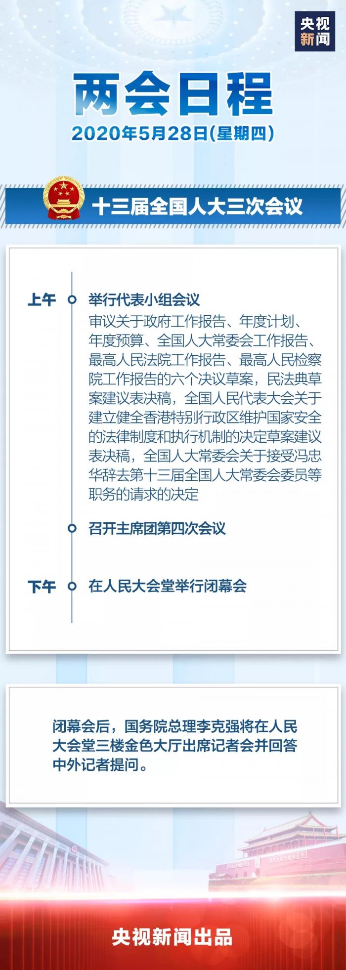 1、十三届全国人大三次会议将于今天(28日)下午在北京人民大会堂举行闭幕会。闭幕会后,国务院总理李克强将会见采访大会的中外记者并回答提问。