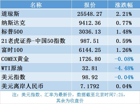 1、美股集体收涨,道指涨逾550点,自3月以来首次站稳25000点关口,标普重回3000点上方;金融与制造业领涨大盘,蔚来汽车因财报公布前评级上调收盘大涨逾8%;瑞幸咖啡收盘再涨21%,两日累涨超90%;欧洲主要股市因欧盟复苏基金计划推动小幅收涨。21老虎证券-中国50指数报987.51点,跌0.59%。50只成分股中17只上涨,其中金沙中国有限公司、台积电、中信证券等涨幅居前。