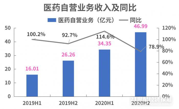 阿里健康的医药自营业务主要是通过自身的线上自营店销售合作方的药品、保健品、医疗器械等产品,2020H2阿里健康的医药自营业务收入为46.99亿元,虽然同比增速依然可观,有78.9%,但是和过去三个报告期相比,增速创了新低。