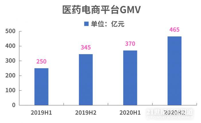 阿里健康持续不断从阿里巴巴旗下的天猫收购跟医药、医疗器械,保健品等相关的栏目,形成了自身的医药电商板块。公司这一块业务2020H2的GMV(商品交易总额)虽然创了新高达到465亿元,但是GMV的同比增速已经降到34.8%,和公司这块收入的同比增速接近,公司这块收入也降到了35.6%。同样是最近两个财年的最低增速。