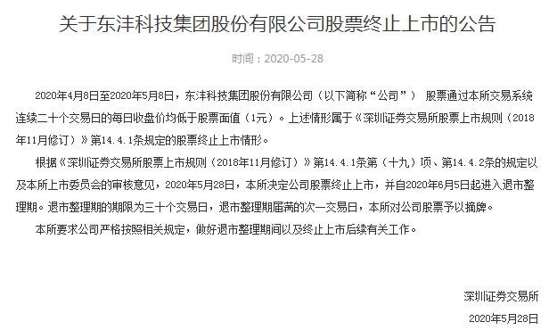 5月28日盘后,深交所发布公告称,2020年4月8日至2020年5月8日,东沣科技集团股份有限公司(简称“东沣B”)连续二十个交易日的每日收盘价均低于股票面值(1元)。交易所决定东沣B终止上市,并自2020年6月5日起进入退市整理期。