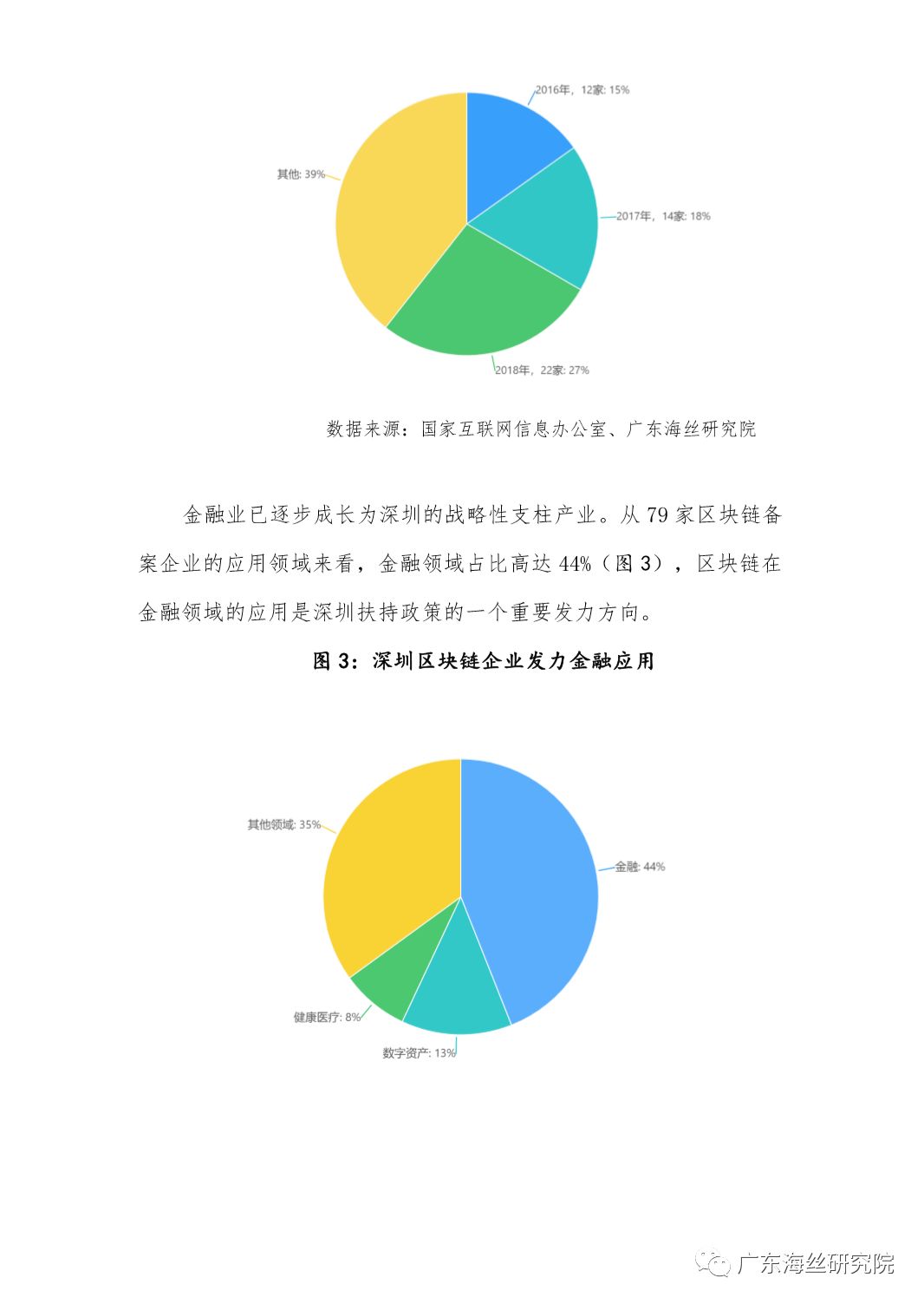 报告指出,深圳重视金融创新,把区块链技术作为推动金融科技发展的重要手段。区块链在金融领域的应用是深圳扶持政策的一个重要发力方向,早在 2016年,深圳市金融业发展“十三五”规划中,已经确定了区块链的重点发展地位。从深圳 79 家区块链备案企业的应用领域来看,金融领域占比高达 44%。相比其他城市,深圳早早成立了金融区块链合作联盟,聚焦于区块链在金融方面应用。该联盟集结了包括微众银行、平安银行、招银网络、恒生电子、京东金融、腾讯、华为、银链科技、深圳市金融信息服务协会等在内的 31 家企业,旨在整合及协调金融区块链技术研究资源,形成金融区块链技术研究和应用研究的合力与协调机制。