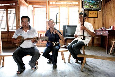 吴胜章和徒弟们在演奏侗戏乐器