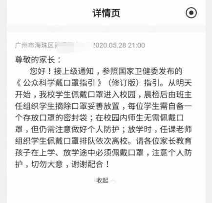 家长提供的截图显示,28日晚,海珠区某学校已发布通知,称参照国家卫健委发布的《公众科学戴口罩指引》(修订版)指引,从29日开始,该校学生佩戴口罩进入校园,晨检后由班主任组织学生摘除口罩妥善放置,每位学生需自备一个存放口罩的密封袋;在校园内师生无需佩戴口罩,但仍需注意做好个人防护;放学时,任课老师组织学生佩戴口罩排队依次离校。