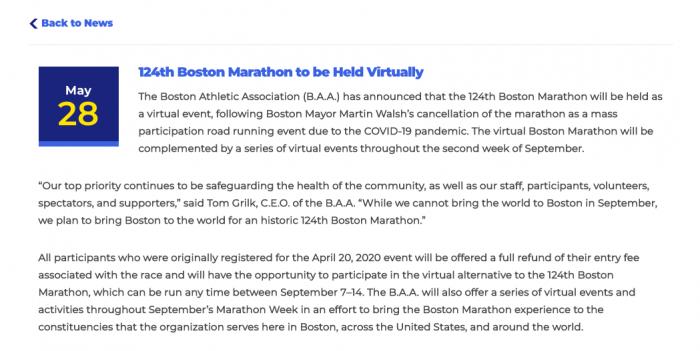 官网提到,注册参加2020年4月20日赛事的所有参赛者,将获得与比赛相关的入场费全额退款,并有机会参加第124届波士顿马拉松的虚拟替代赛,该比赛可在9月7日至14日期间的任何时间进行。