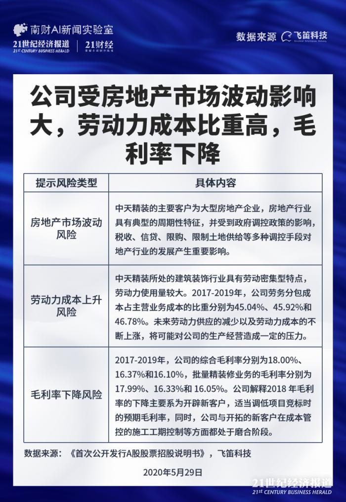 中天精装的主要客户为大型房地产企业,公司提示“如果未来房地产行业景气度持续下行,则可能导致房地产开发企业减少或放缓投资进度、进一步控制成本,从而导致本