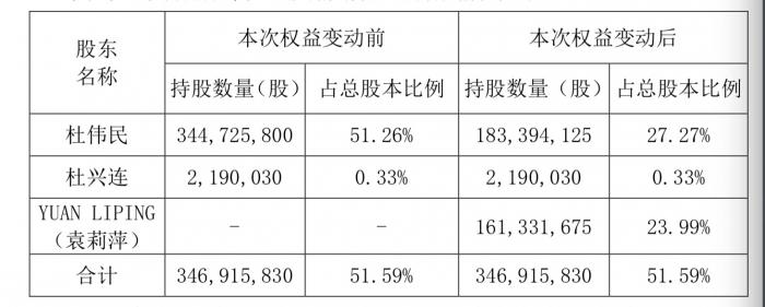 根据公告披露此次股东权益变动不会导致公司控股股东、实际控制人发生变化。此前杜伟民占总股本比例51.26%,变动后27.27%,仍为公司实控人。
