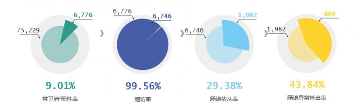 在爱康体检中通过“常卫清”检测的人群,阳性人数占比9.01%,针对阳性人群进行的随访占比较去年同期增长23.17个百分点。在随访过程中,有1982人前往医院通过肠镜进一步检查和/或病理诊断,其中869人发现肠道异常,检出率为43.84%。