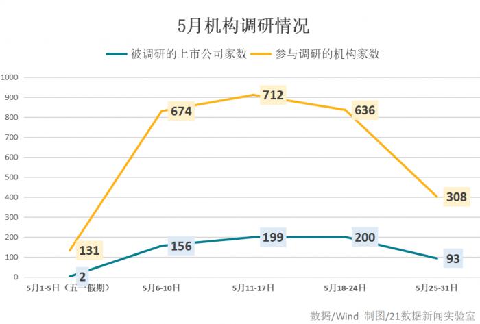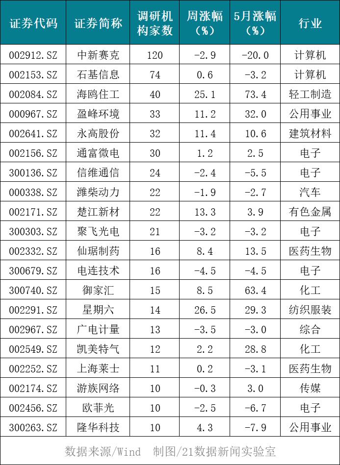 具体到上市公司,5月25日至5月31日,中新赛克(002912.SZ)最受机构青睐,共计接待了120家机构。从机构调研次数来看,海鸥住工(002084.SZ)机构调研最为密集,共获机构24次调研。