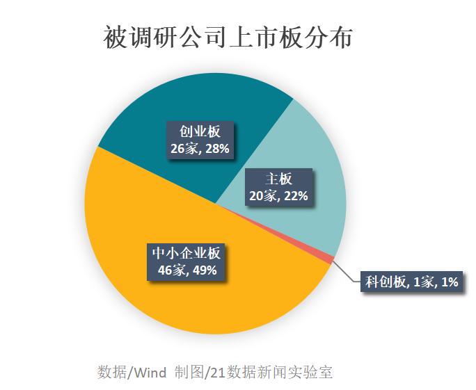 21数据新闻实验室统计发现,被机构调研的这93家公司中,属于中小板的有46家,属于创业板的有26家,另外20家来自主板,1家来自科创板(方邦股份,688020.SH)。