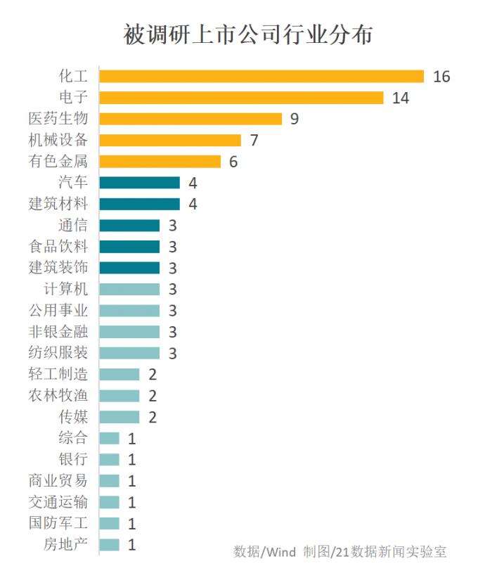 从行业分布来看,过去一周化工行业最受机构青睐,16家相关公司被调研,紧随其后的是电子(14家),医药生物(9家),机械设备(7家)。