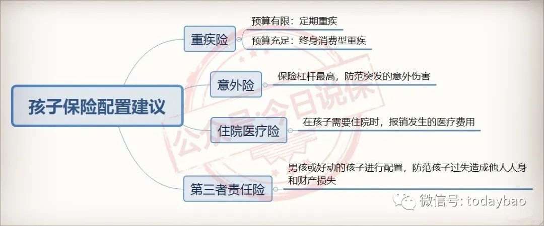孩子的保险配置很简单,最核心也最为必要的险种就是重疾险+意外险+住院医疗险。