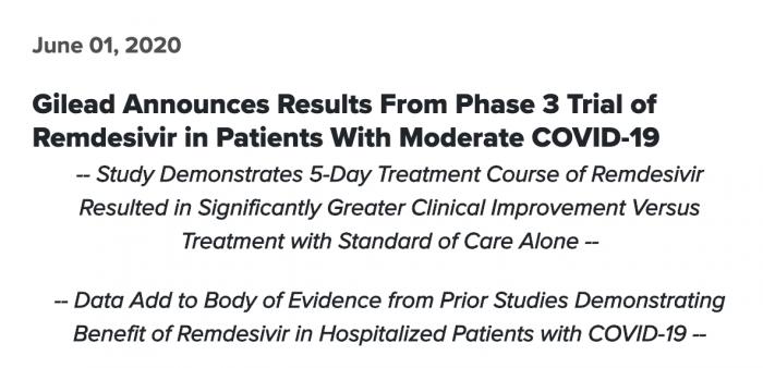 6月1日,美股盘前,吉利德宣布了瑞德西韦(Remdesivir)针对中度新冠肺炎(COVID-19)患者的3期临床试验结果:研究证明了其5天治疗过程相对于单独使用护理标准的治疗带来了显著的临床改善。
