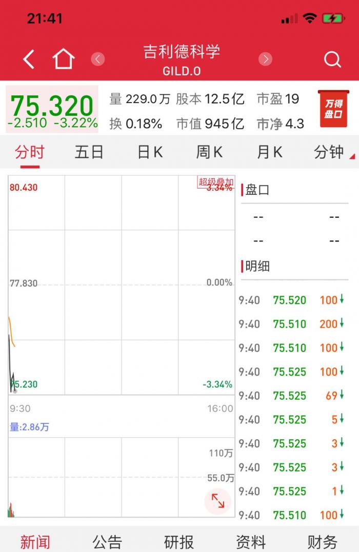 消息一出,吉利德科学(纳斯达克股票代码:GILD)盘前跌逾3%;截至北京时间21:41,盘中跌逾3%。