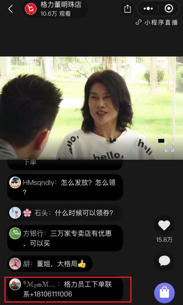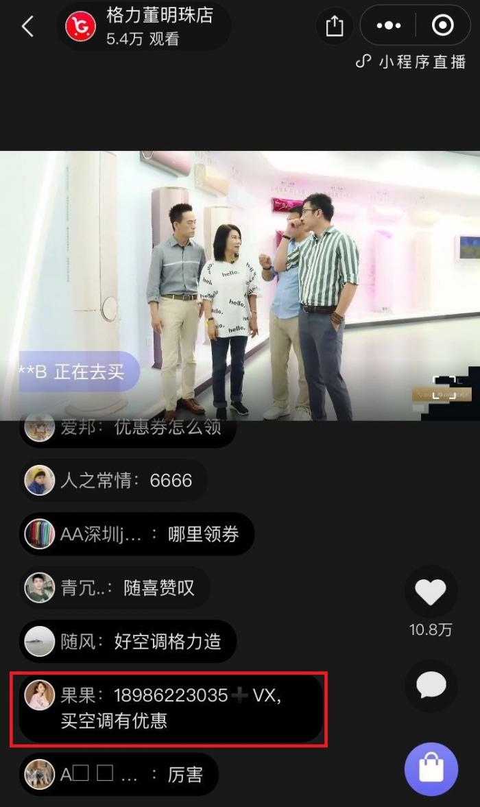 记者发现,在上半场直播期间,有不少格力经销商、员工开始给自己打广告,在平台上留言,写上自己的电话号码,让消费者联系下单。